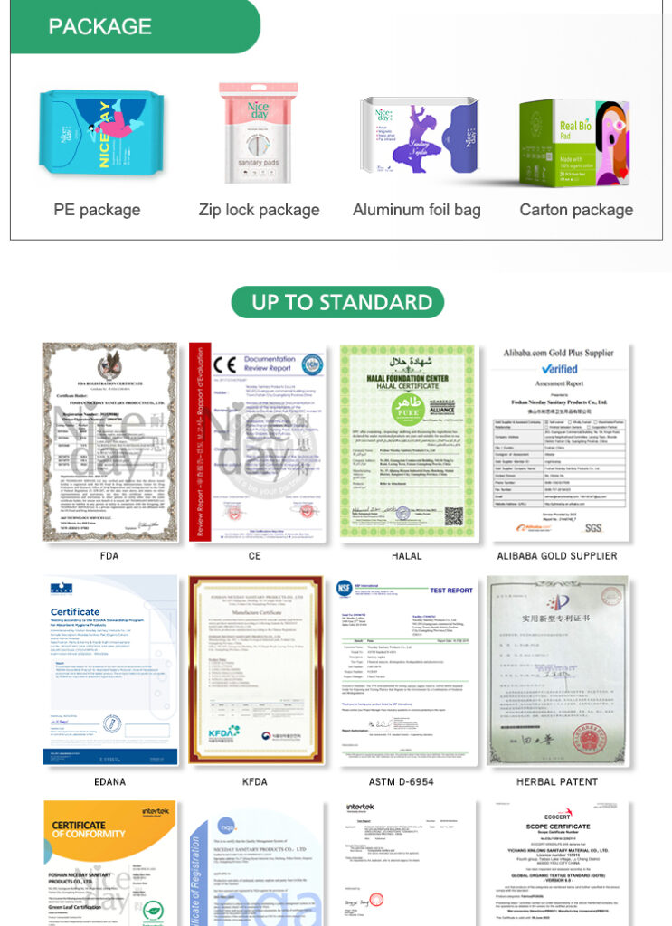 Inner layer | Wood plup, Fluff pulp, Tissue, Absorbant paper, Organic cotton, SAP(Japan’s sumitomo), PLA SAP(Corn starch is biodegradable)or mix the above |