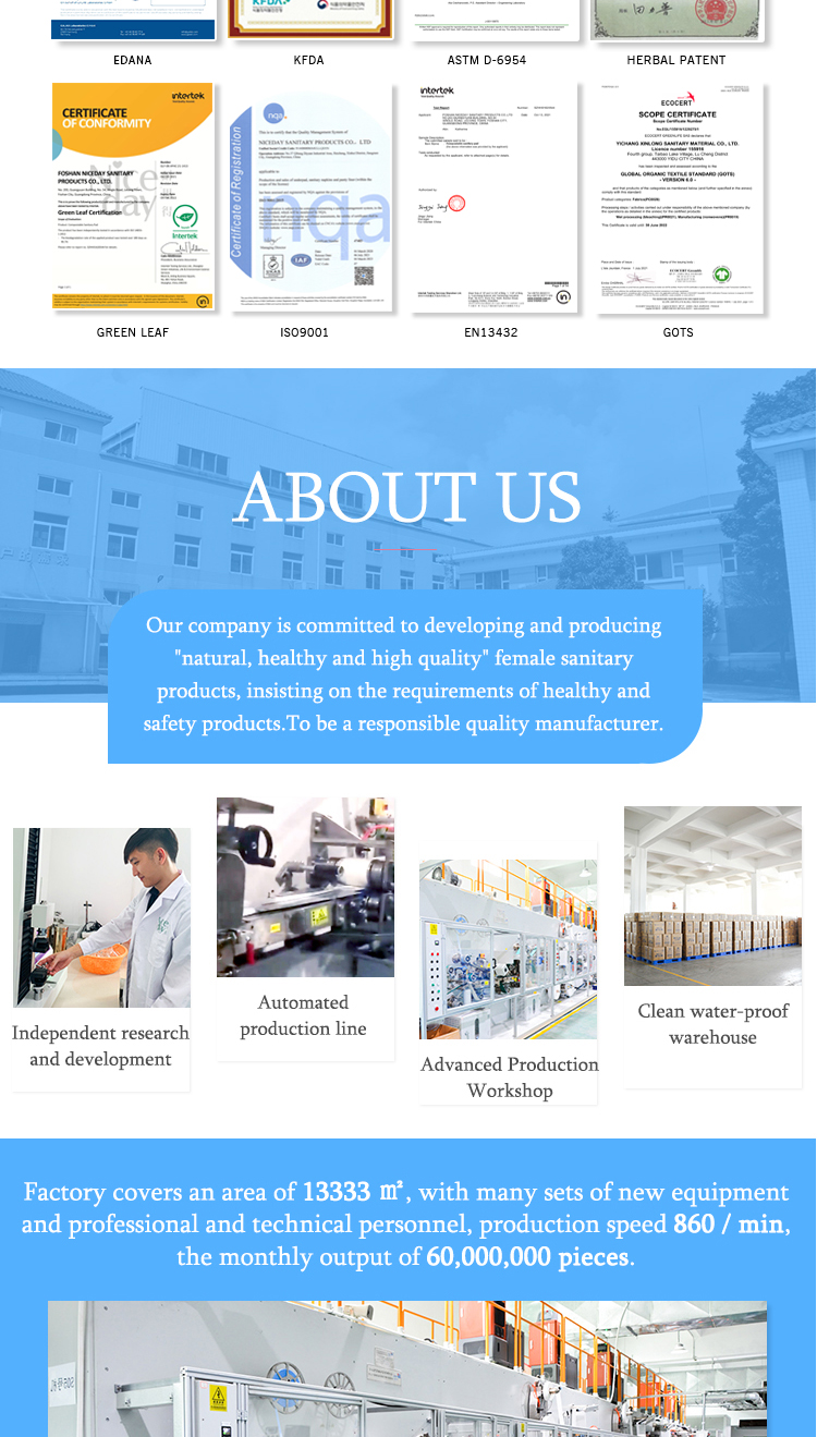 | Surface layer | Dry net, Soft non-woven fabric, 100% pure cotton, Oxygen cotton, Organic cotton, hemp, cotton knitted fabric, Bamboo Fiber, Bamboo Charcoal Fiber, Lyocell, Silk |