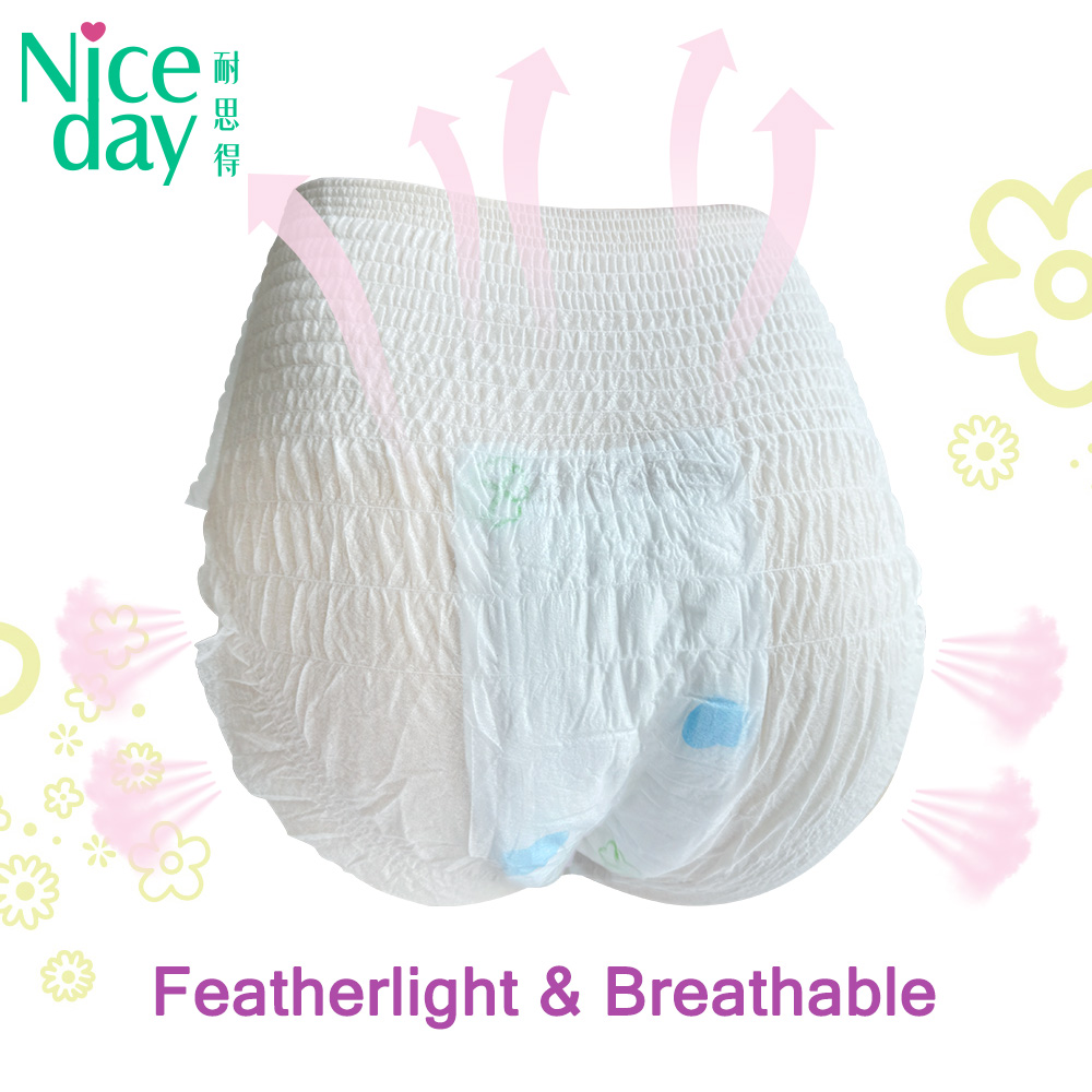 Premium material | 1. Soft non-woven top sheet(Beyond comfortable) 2. 360° Elastic waist band 3. SAP (Super absorbent) 4. Henkel Adhesive(Safe and healthy) 5. Double layers water proof leakage guard 6. Cloth-like Breathable Back-sheet |