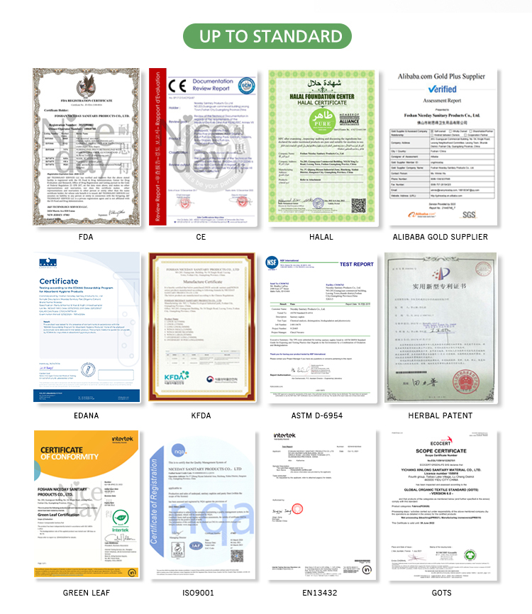 Inner layer | Wood plup, Fluff pulp, Tissue, Absorbant paper, Organic cotton, SAP(Japan’s sumitomo), PLA SAP(Corn starch is biodegradable)or mix the above |