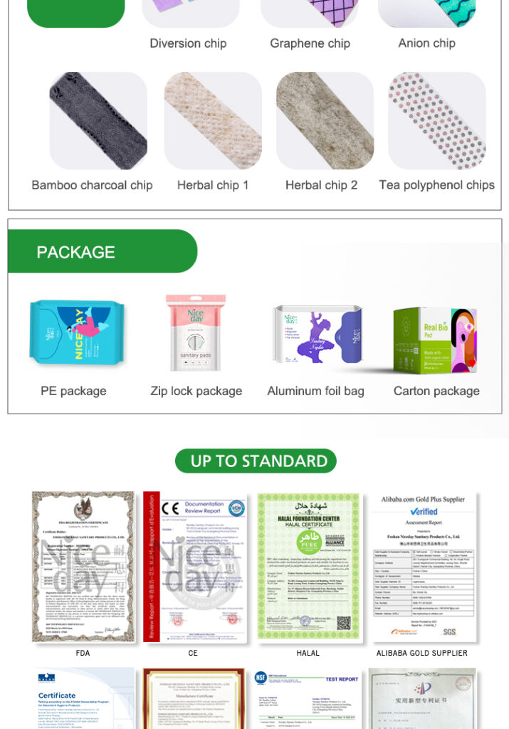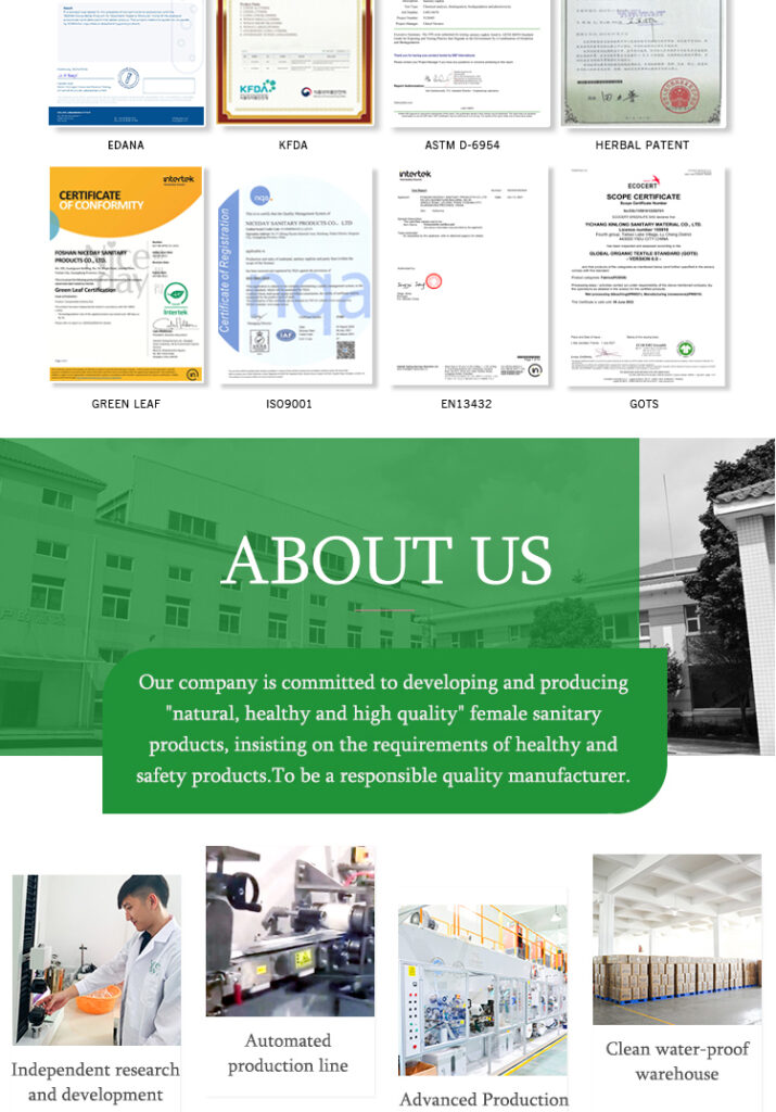 Inner layer | Wood plup, Fluff pulp, Tissue, Absorbant paper, Organic cotton, SAP(Japan’s sumitomo), PLA SAP(Corn starch is biodegradable)or mix the above |