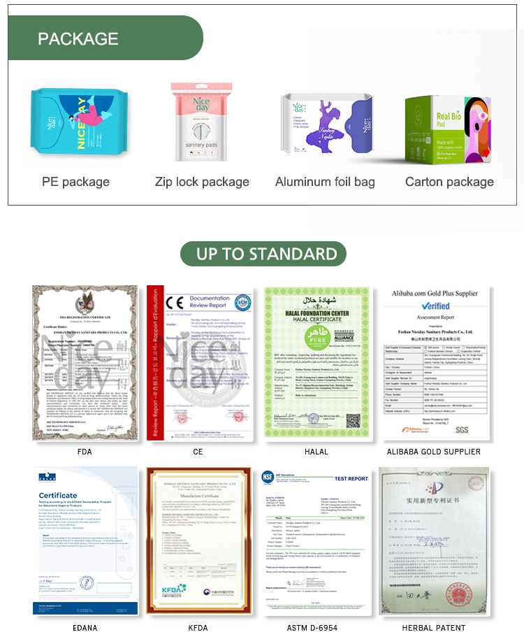 Inner layer | Wood plup, Fluff pulp, Tissue, Absorbant paper, Organic cotton, SAP(Japan’s sumitomo), PLA SAP(Corn starch is biodegradable)or mix the above |