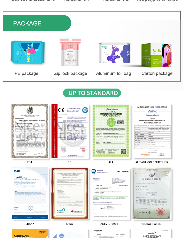 Inner layer | Wood plup, Fluff pulp, Tissue, Absorbant paper, Organic cotton, SAP(Japan’s sumitomo), PLA SAP(Corn starch is biodegradable)or mix the above |